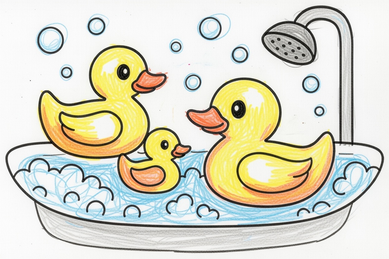 Three playful rubber ducks float in a bubbly tub! This simple coloring page helps toddlers improve coordination, learn shapes, and enjoy cheerful bath-time fun.