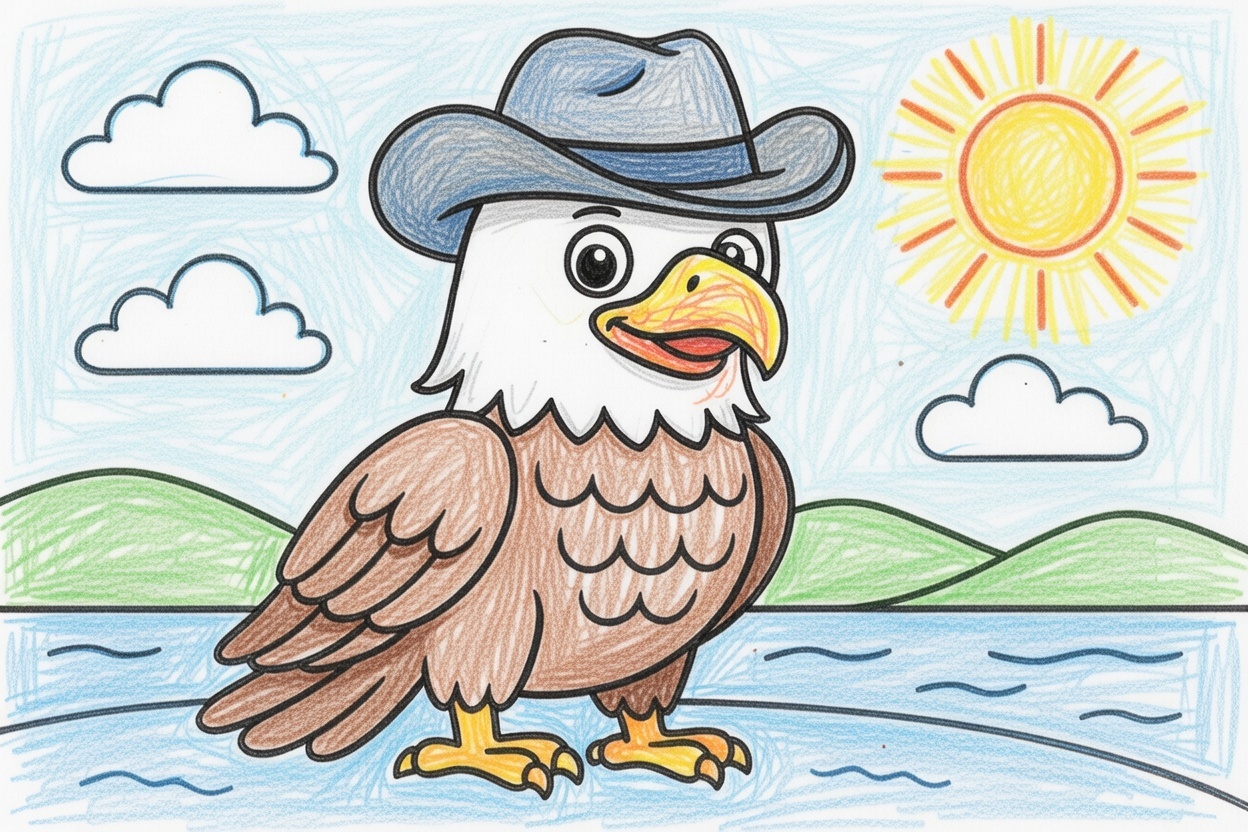 A cheerful American eagle wears a cowboy hat under the sunny sky! This fun coloring page helps toddlers explore creativity, shapes, and coordination through simple bold lines.