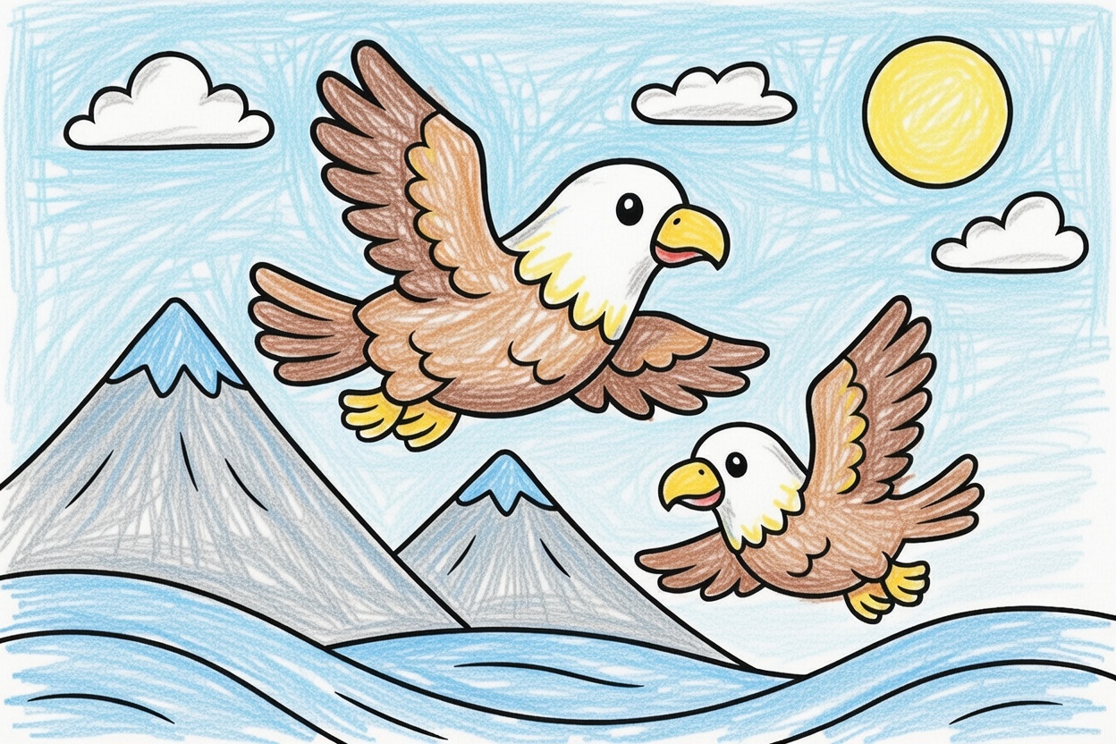 Two cheerful eagles soar above the mountains under the bright sun! This simple coloring page helps toddlers explore nature, build motor skills, and enjoy fun creative play.