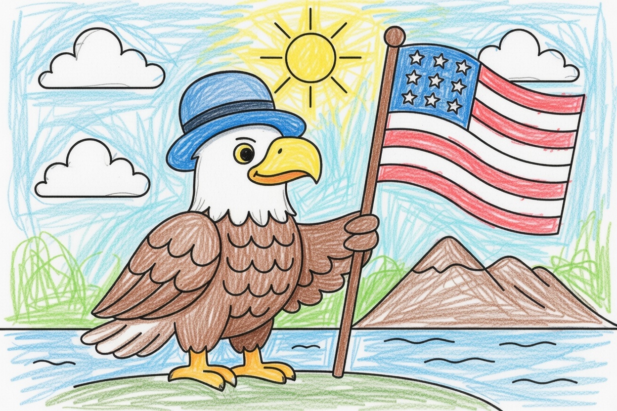 A proud American eagle waves the flag under the sunny sky! This simple coloring page helps toddlers learn about freedom, shapes, and colors through fun creative play.