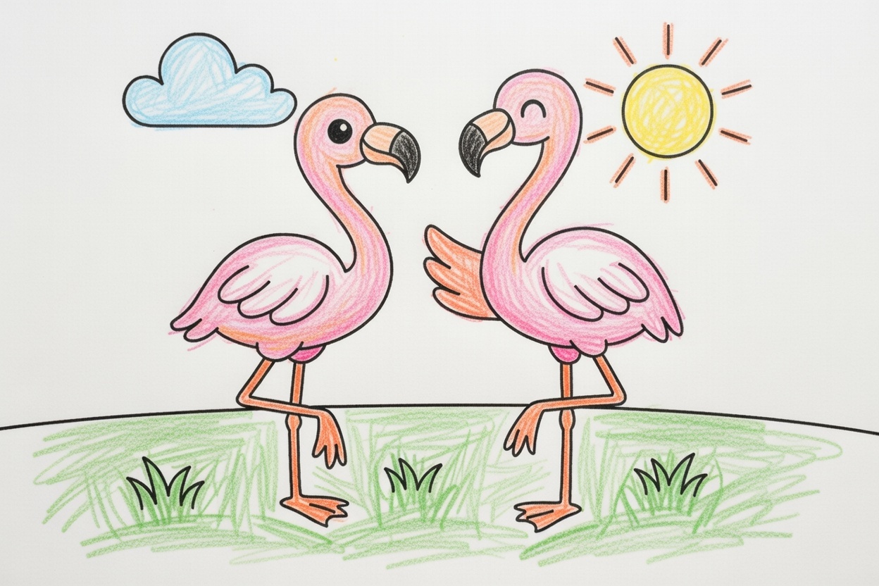 Two flamingos dance under the bright sun! This joyful coloring page helps toddlers express creativity, improve coordination, and enjoy simple cheerful shapes.