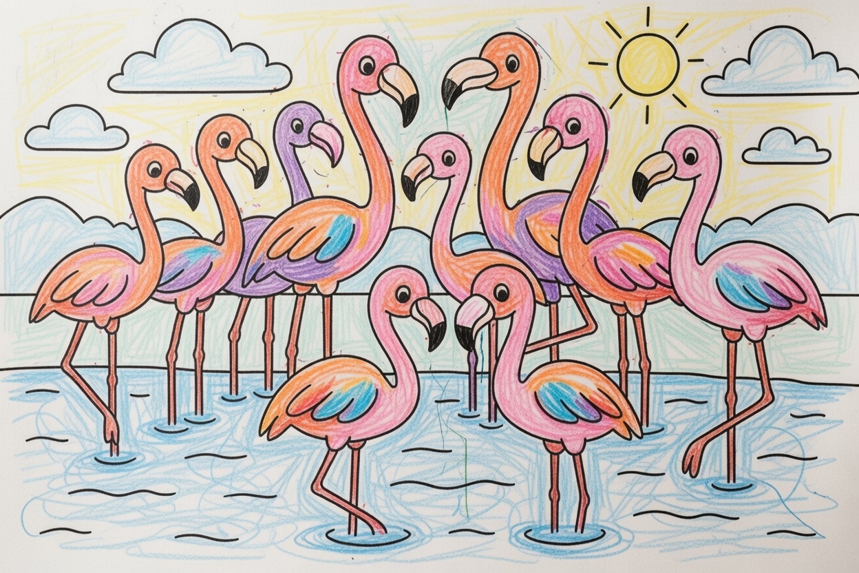 A cheerful crowd of flamingos stands together under the sunny sky! This simple coloring page helps toddlers explore shapes, animals, and creativity through bold, friendly outlines.