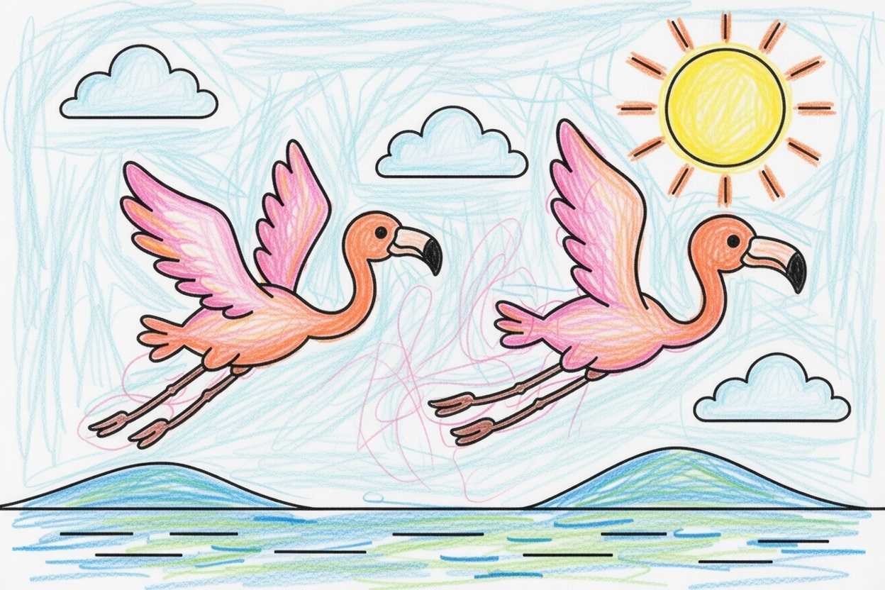 Two flamingos soar gracefully across the sunny sky! This simple coloring page helps toddlers explore motion, animals, and creativity through fun, easy outlines.
