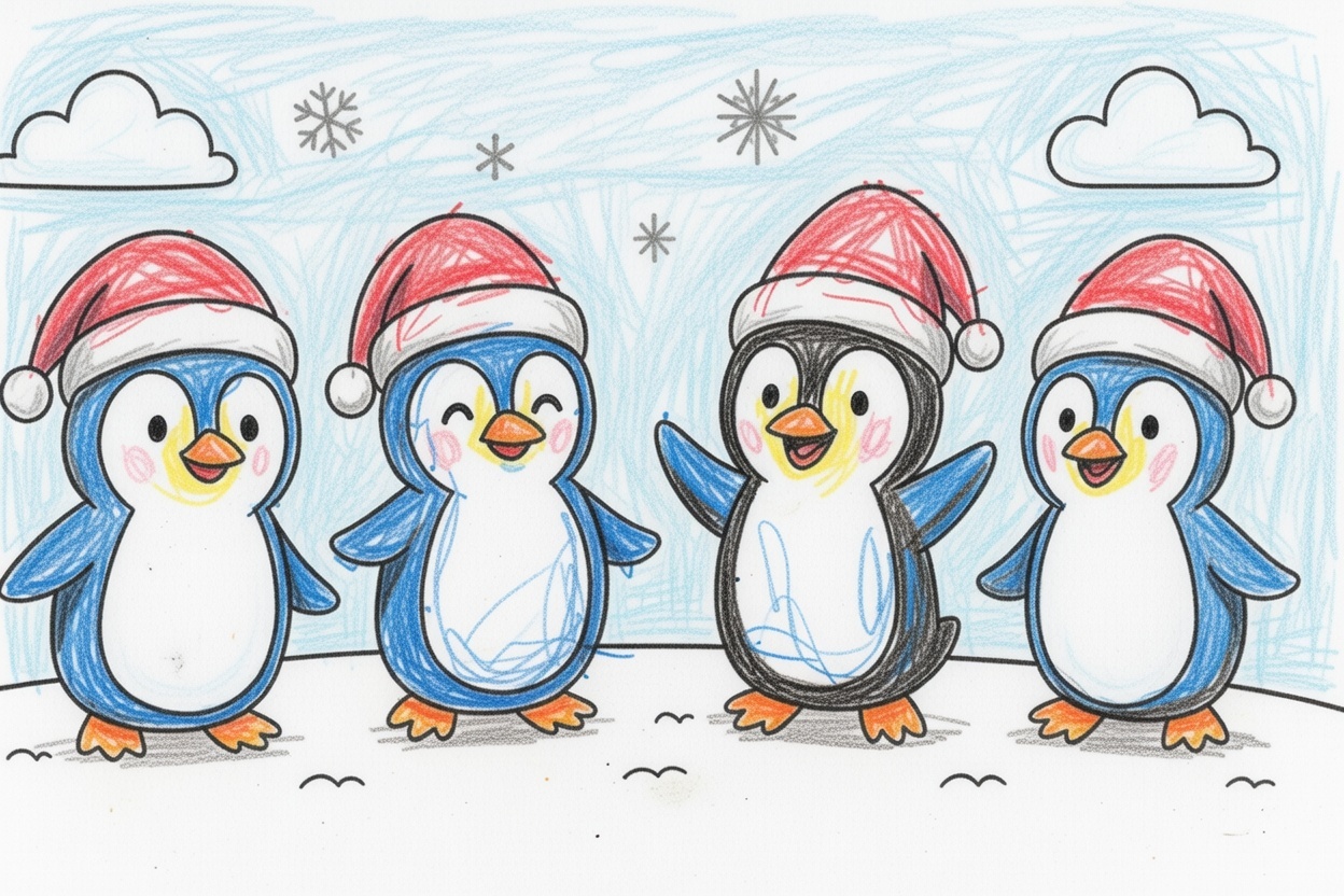 Four happy penguins in Santa hats celebrate on the ice! This festive coloring page helps toddlers learn about winter, holidays, and creativity through simple cheerful shapes.