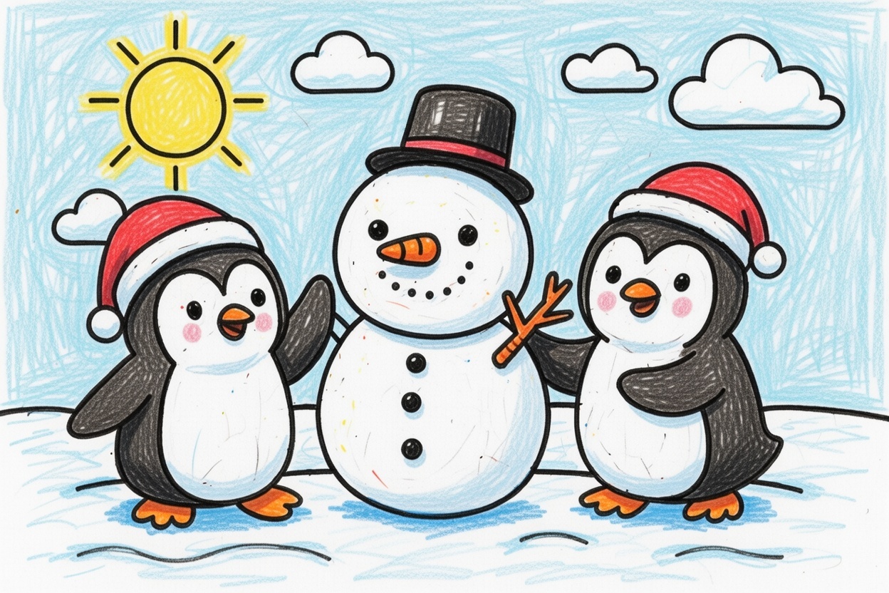 Two cheerful penguins build a big snowman together under the sunny sky! This fun winter coloring page helps toddlers learn teamwork, creativity, and coordination through simple shapes.