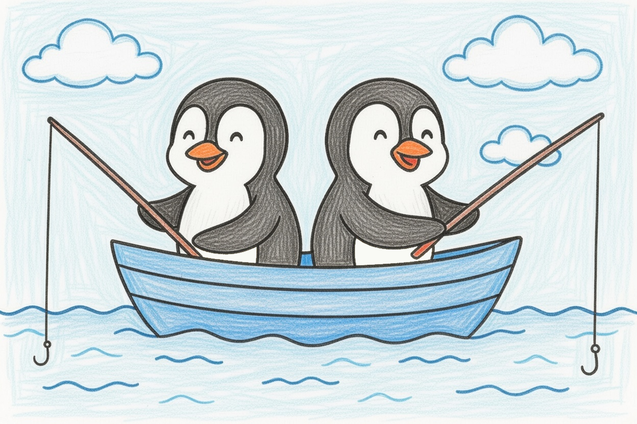 Two happy penguins fish together on the ice under the bright sun! This fun coloring page helps toddlers explore winter scenes, shapes, and creativity through simple bold outlines.