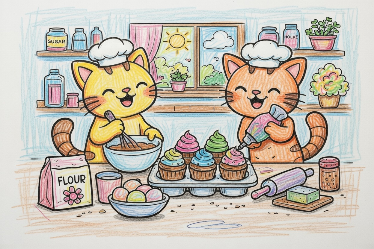 A simple black-and-white coloring page showing two cute adult cats baking a cake together. Clear shapes and bold outlines make it easy for young children to color while developing focus, coordination, and early creativity.