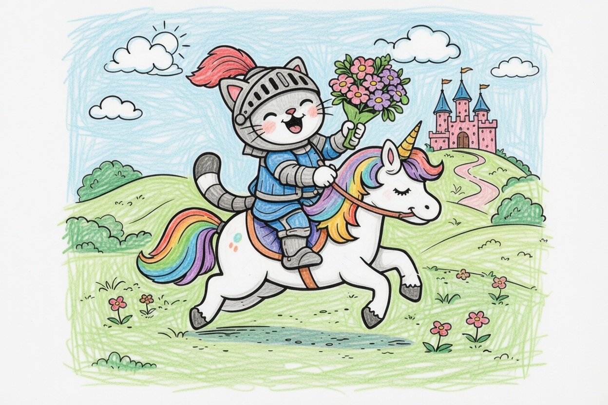 A simple black-and-white coloring page showing a cute cat knight riding a unicorn and holding a bouquet of flowers. Bold outlines and clear shapes make it easy for young children to color while encouraging imagination and creativity.