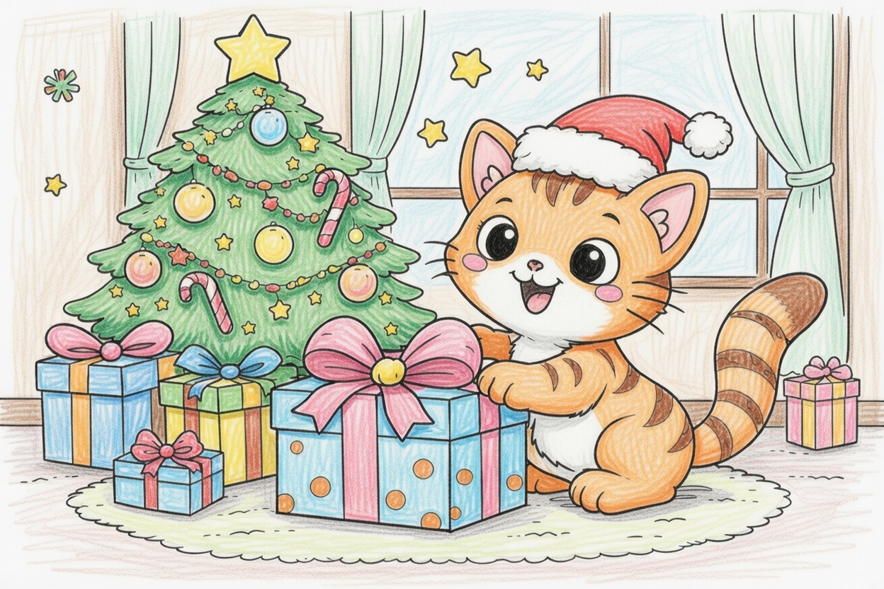 A simple black-and-white coloring page showing a tiny kitten in a diaper happily opening a Christmas present. Bold outlines and clear shapes make it easy for young children to color while enjoying a festive, cozy scene.