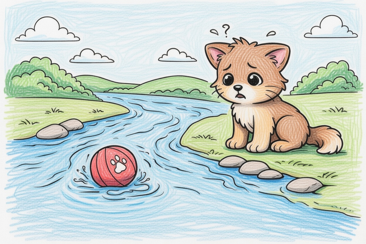 A cute kitten looks puzzled after dropping its ball into the river. This printable coloring page for kids, toddlers, and preschoolers has bold lines, big shapes, and a simple nature scene.