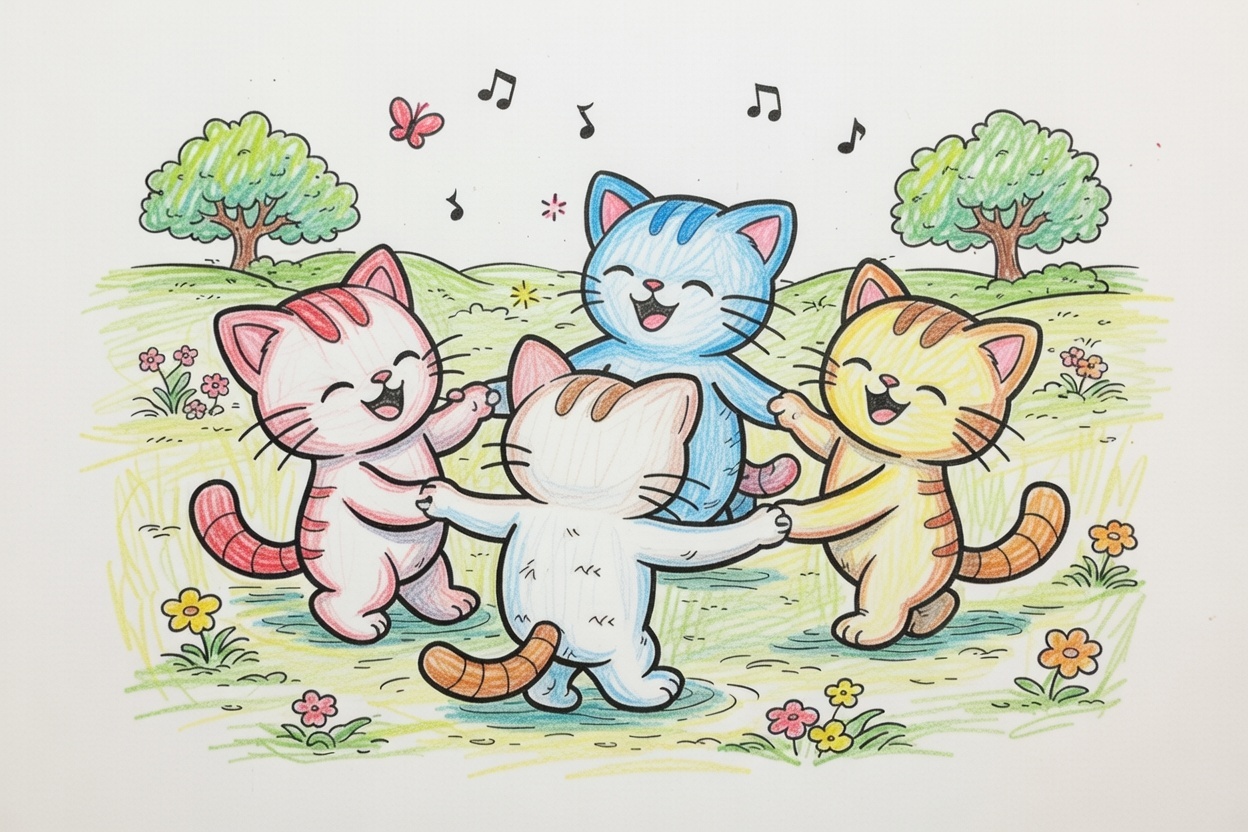 A simple black-and-white coloring page showing happy kittens holding paws and dancing in a circle. Bold outlines and clear shapes make it easy for young children to color while expressing joy, movement, and friendship.
