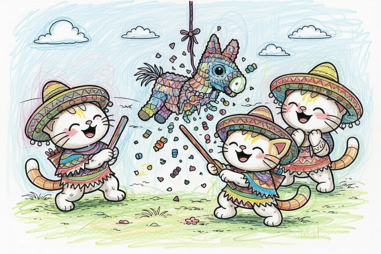 A simple black-and-white coloring page showing happy kittens wearing sombreros and playing with a piñata. Bold outlines and large, clear shapes make it easy for young children to color while enjoying a fun celebration scene.