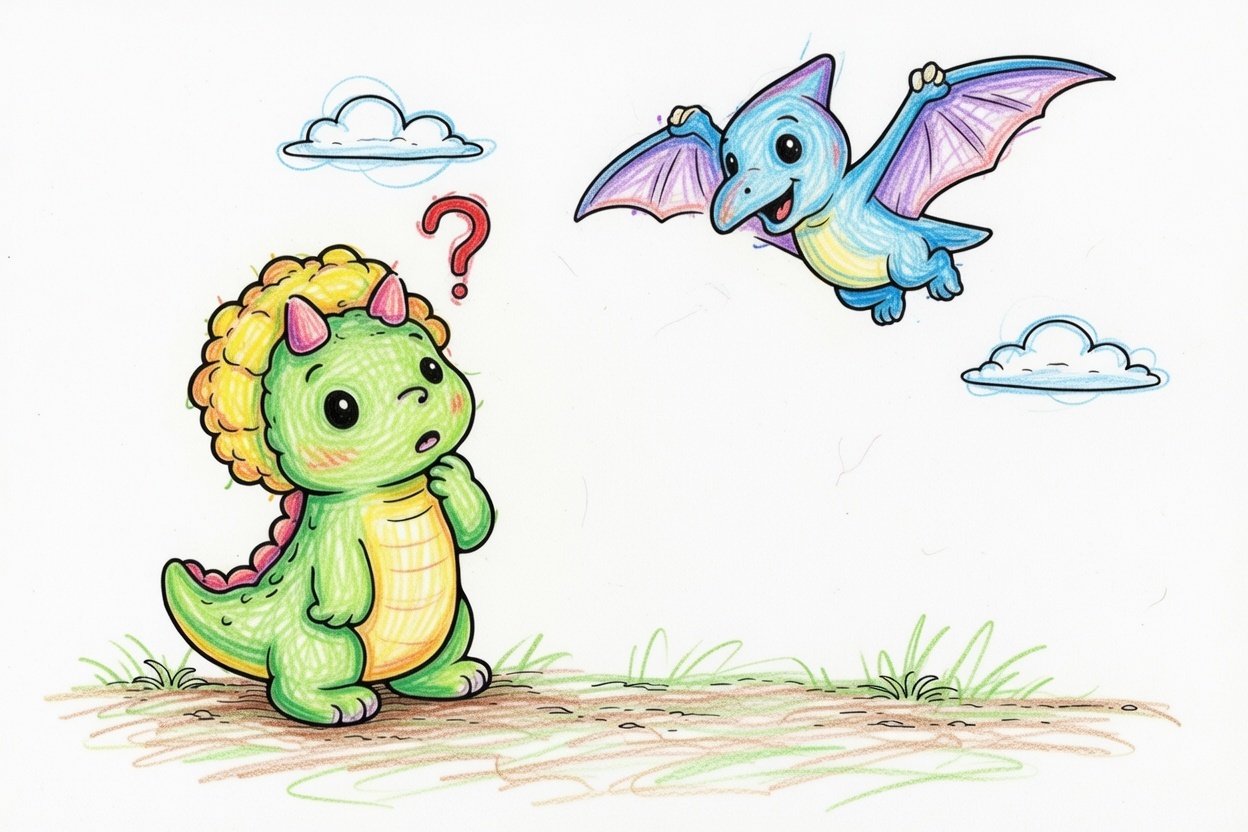A simple black-and-white coloring page showing a puzzled baby dinosaur looking up at a flying pterodactyl. Bold outlines and large shapes make it easy for young children to color while exploring curiosity and wonder.