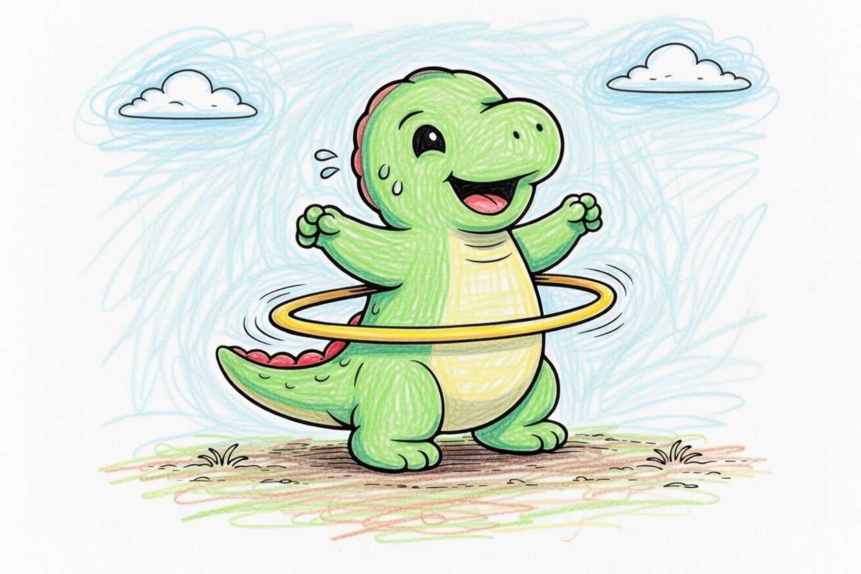 A simple black-and-white coloring page showing a happy baby T-rex joyfully spinning a hula hoop. Bold outlines and large shapes make it easy for young children to color while enjoying movement and playful fun.