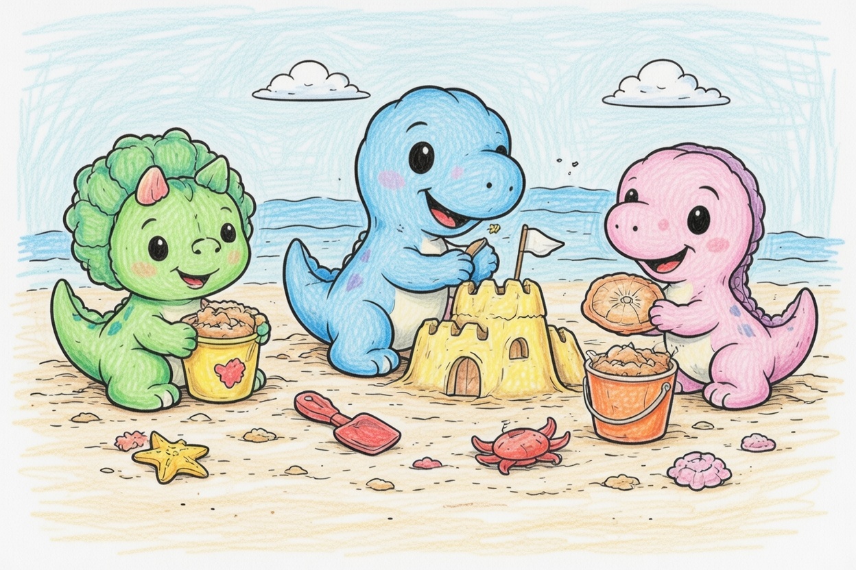 A simple black-and-white coloring page showing cute baby dinosaurs playing in the sand. Big shapes and bold outlines make it easy for young children to color while enjoying calm, creative play.