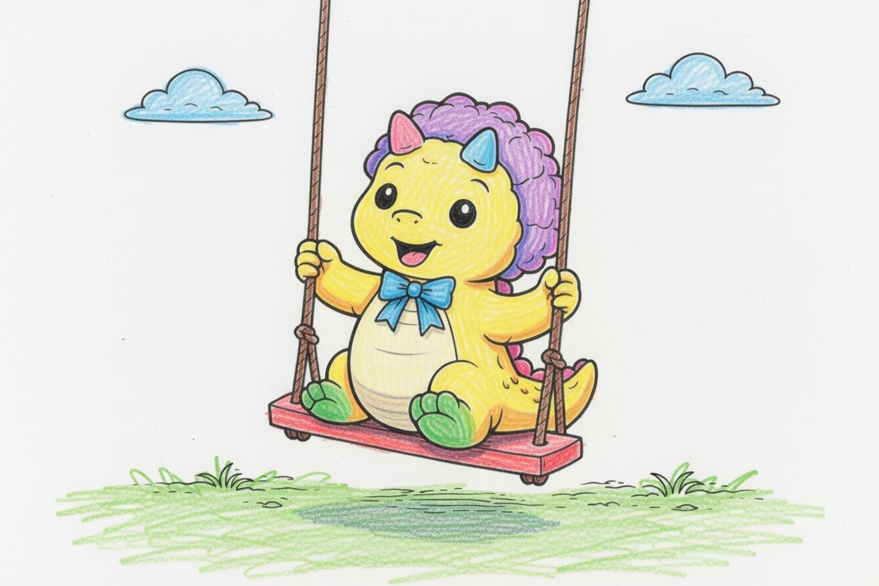 A simple black-and-white coloring page showing a cute baby dinosaur enjoying a hanging swing. Bold outlines and large shapes make it easy for young children to color while exploring movement and playful fun.