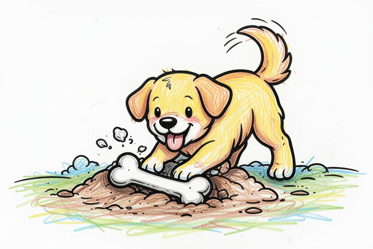 A cute adult dog happily digs a hole to hide a bone. This printable coloring page for kids, toddlers, and preschoolers has bold outlines, simple shapes, and a fun outdoor scene for easy coloring.