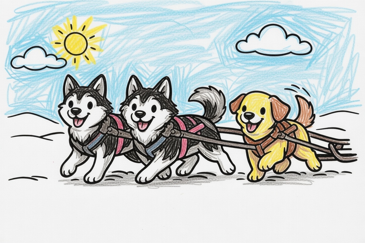 Cute adult sled dogs pull together in a simple winter scene. This printable coloring page for kids, toddlers, and preschoolers has bold lines and big shapes, perfect for easy coloring and fun.