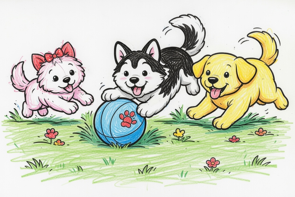Three cute adult dogs happily play with a big ball. This printable coloring page for kids, toddlers, and preschoolers has bold outlines, large shapes, and a simple outdoor scene for easy coloring.