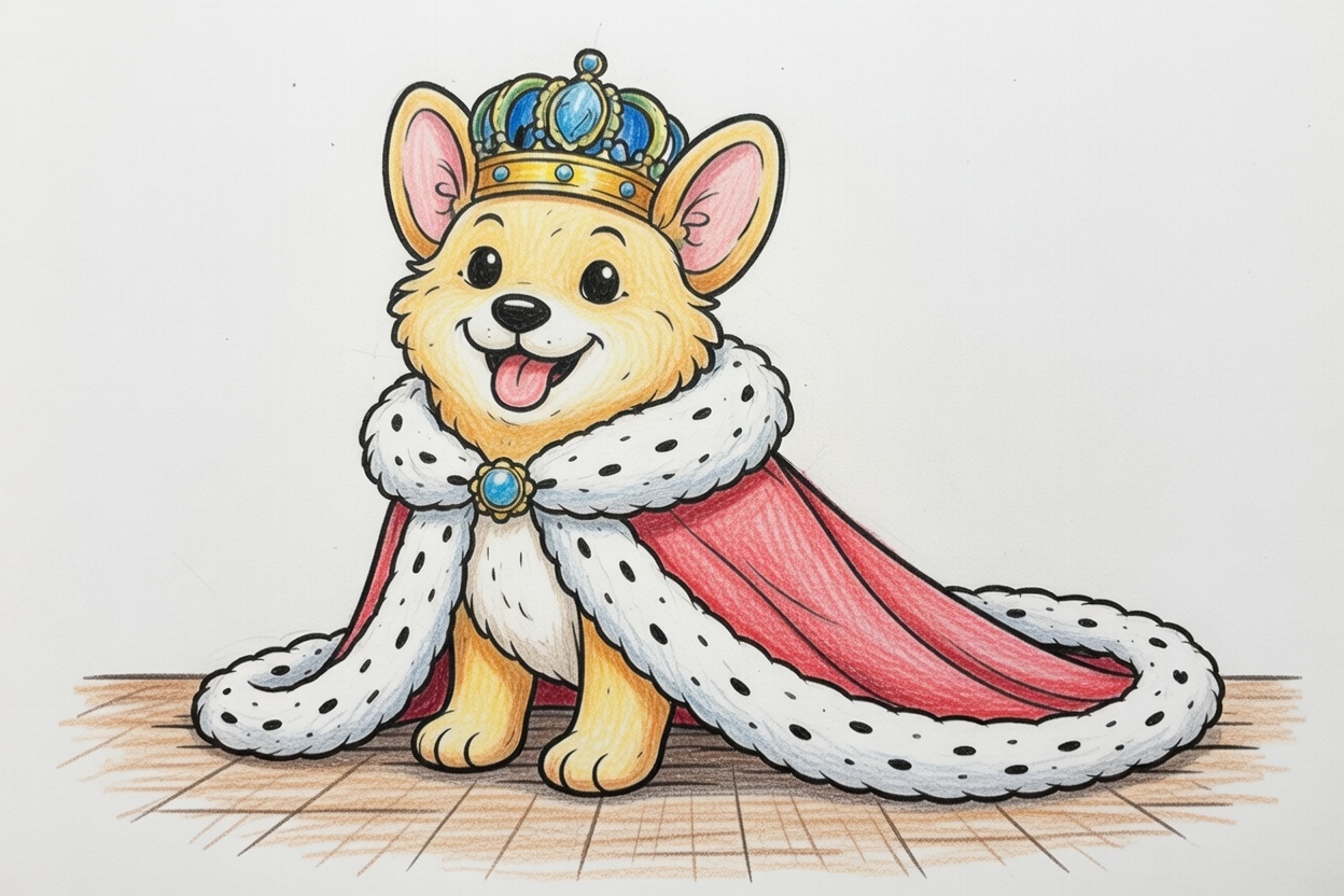 A cute adult corgi wears a crown and royal cape. This printable coloring page for kids, toddlers, and preschoolers has bold lines, big shapes, and a simple royal theme for easy coloring fun.