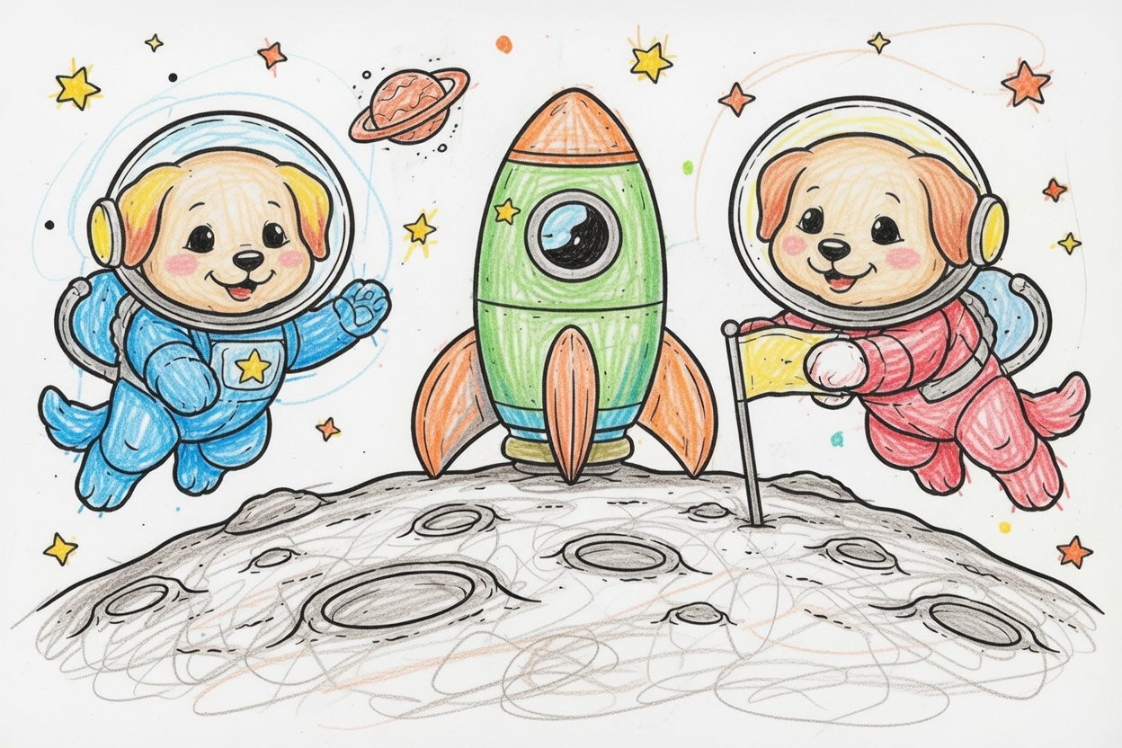 Two tiny puppies in astronaut suits float in space near a rocket. This printable coloring page for kids, toddlers, and preschoolers has bold lines, big shapes, and a fun space scene.