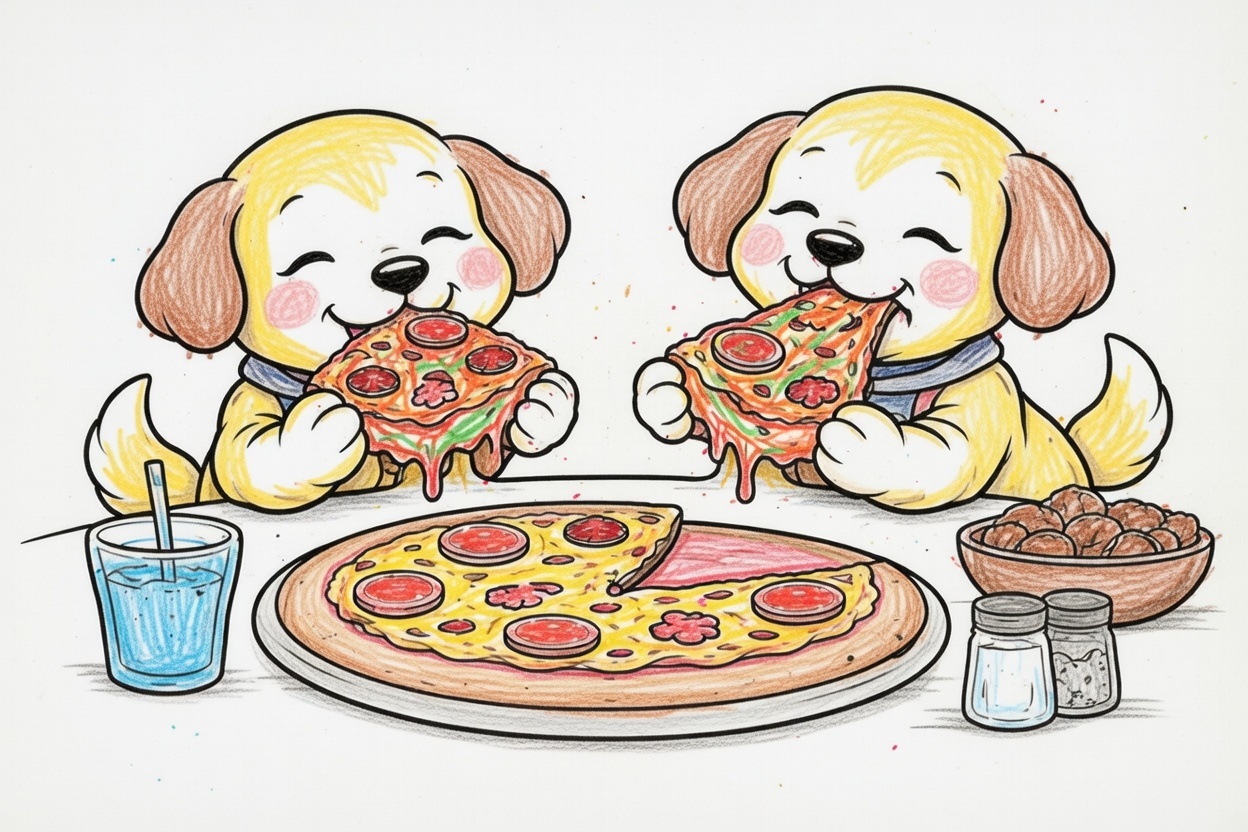 Two happy puppies enjoy eating pizza together. This printable coloring page for kids, toddlers, and preschoolers has bold outlines, large shapes, and a fun mealtime scene.