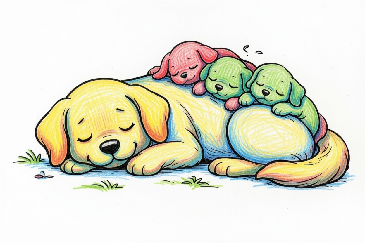 Very small puppies sleep cozily on their mother dog. This printable coloring page for kids, toddlers, and preschoolers has bold lines, big shapes, and a calm, loving scene.