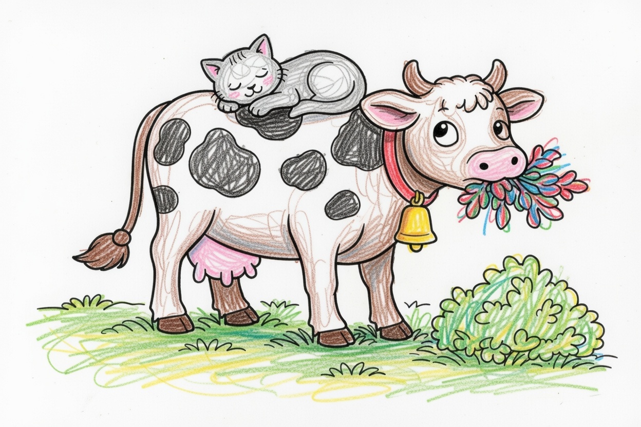 A sweet cat sleeps on the cow’s back while the cow calmly chews a bush. This printable coloring page for kids, toddlers, and preschoolers has bold lines, big shapes, and a gentle farm scene.