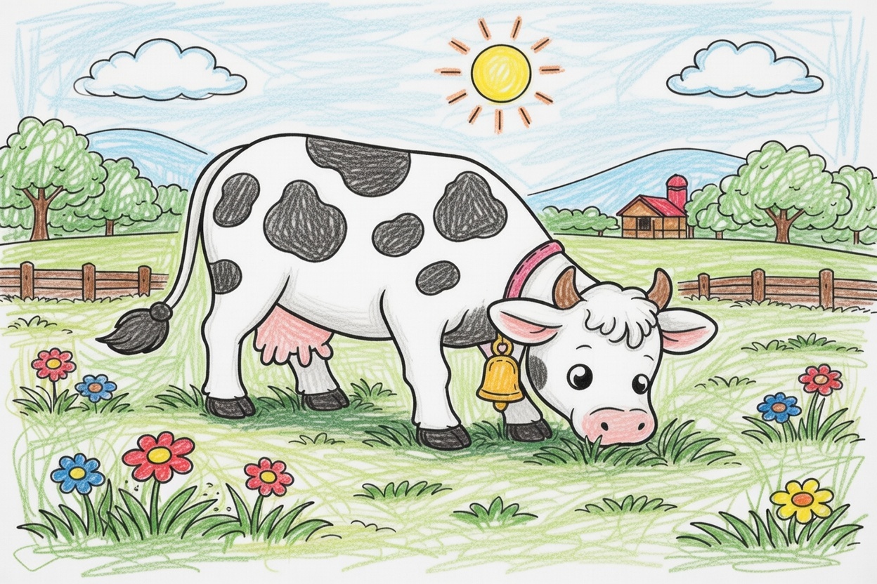 A calm cow grazes on green grass in a sunny meadow. This printable coloring page for kids, toddlers, and preschoolers has bold lines, large shapes, and a simple farm scene.