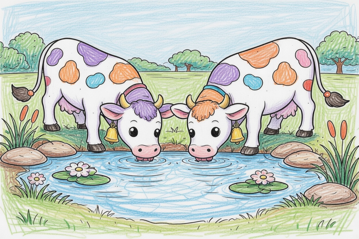 Two calm cows drink water together at a pond. This printable coloring page for kids, toddlers, and preschoolers has bold lines, large shapes, and a simple farm scene.