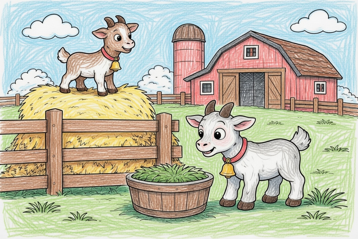Two cute goats enjoy a calm day on a farm with hay and a barn nearby. This printable coloring page for kids, toddlers, and preschoolers has bold lines, large shapes, and very simple details.