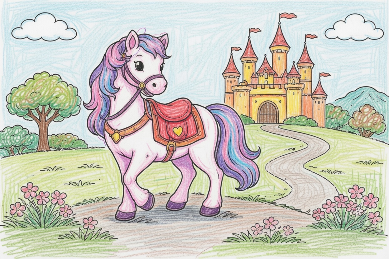 Printable coloring page for kids and toddlers with a beautiful horse wearing a saddle on a hill near a castle. Simple shapes and bold lines make this easy and fun for preschool coloring.