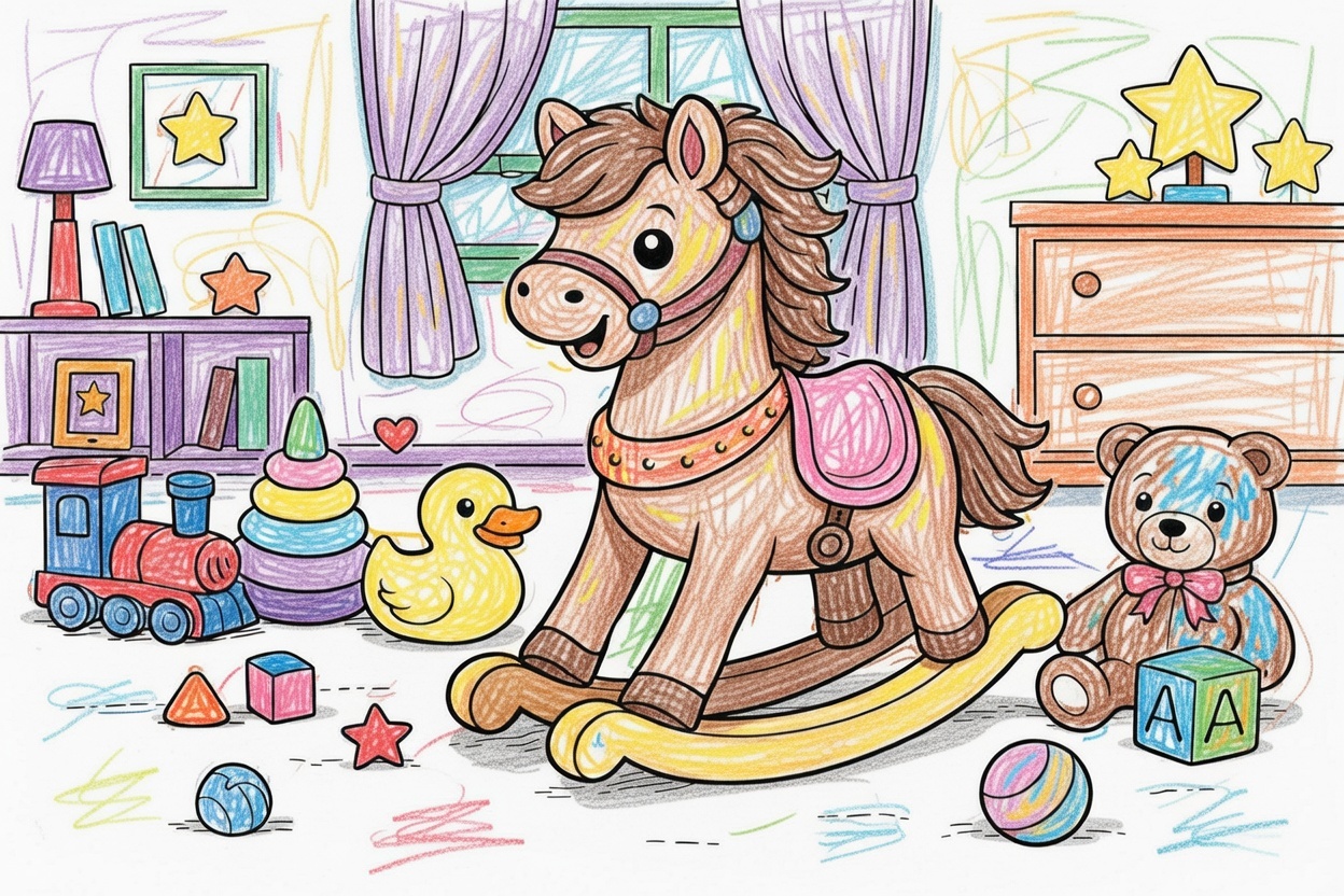Printable coloring page for kids and toddlers featuring a cute toy rocking horse in a cozy room. Simple shapes and bold outlines make this preschool coloring page easy and fun.