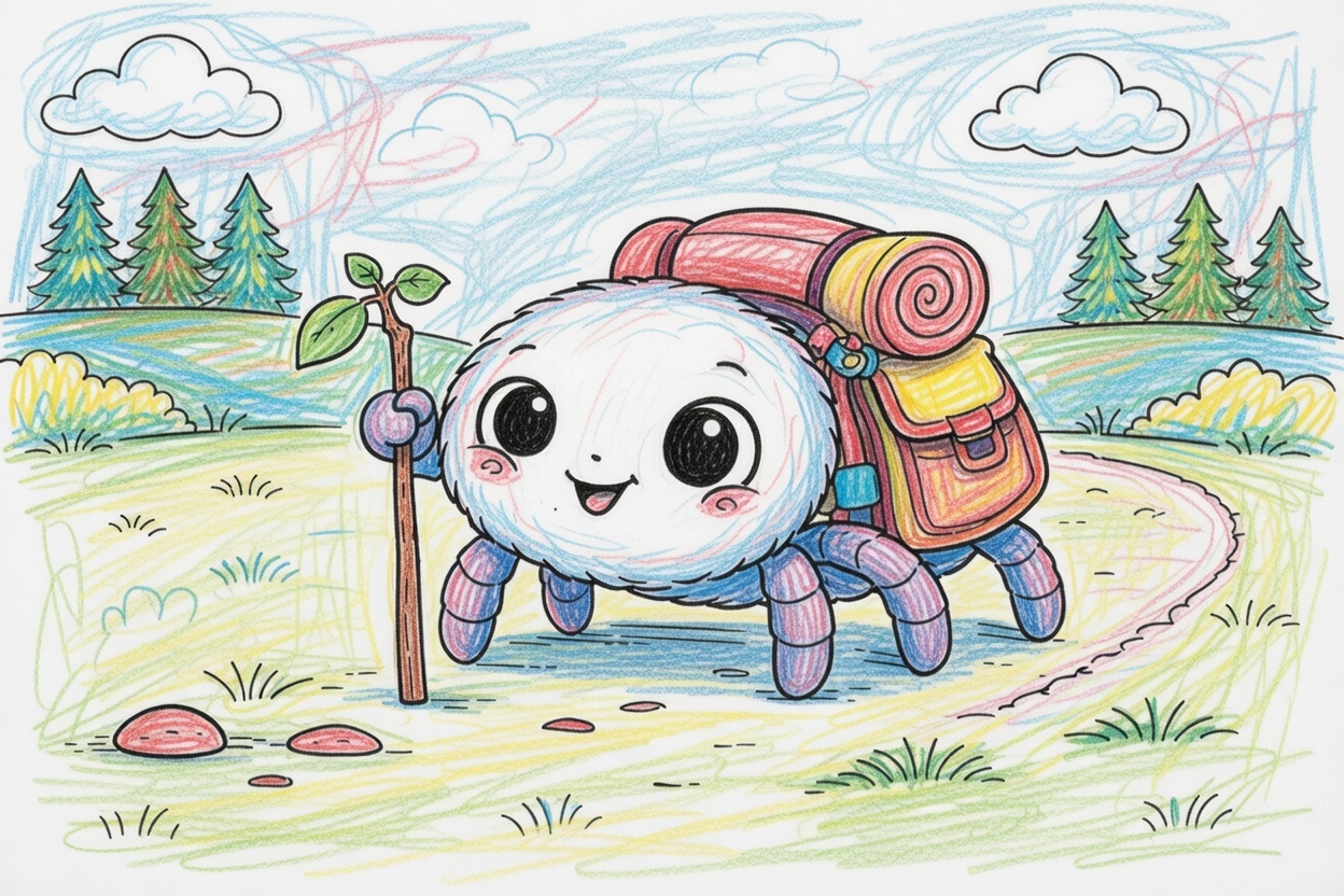 Printable coloring page for kids and toddlers with a cute spider wearing a backpack and going on a journey. Simple shapes and bold outlines make this preschool coloring page easy to color.