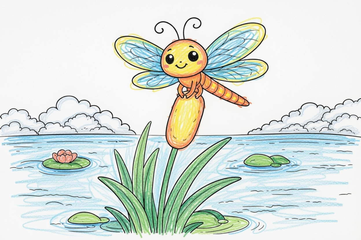 Simple printable coloring page for kids and toddlers showing a cute dragonfly sitting on a cattail by the water. Big shapes and bold outlines make it easy for preschool coloring.