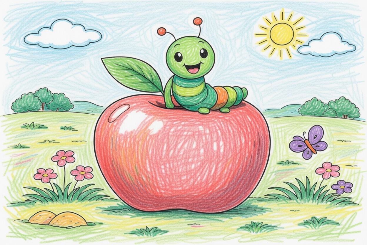 Printable coloring page for kids and toddlers with a happy caterpillar sitting on a big apple. Simple shapes and bold outlines make this easy and fun for preschool coloring.
