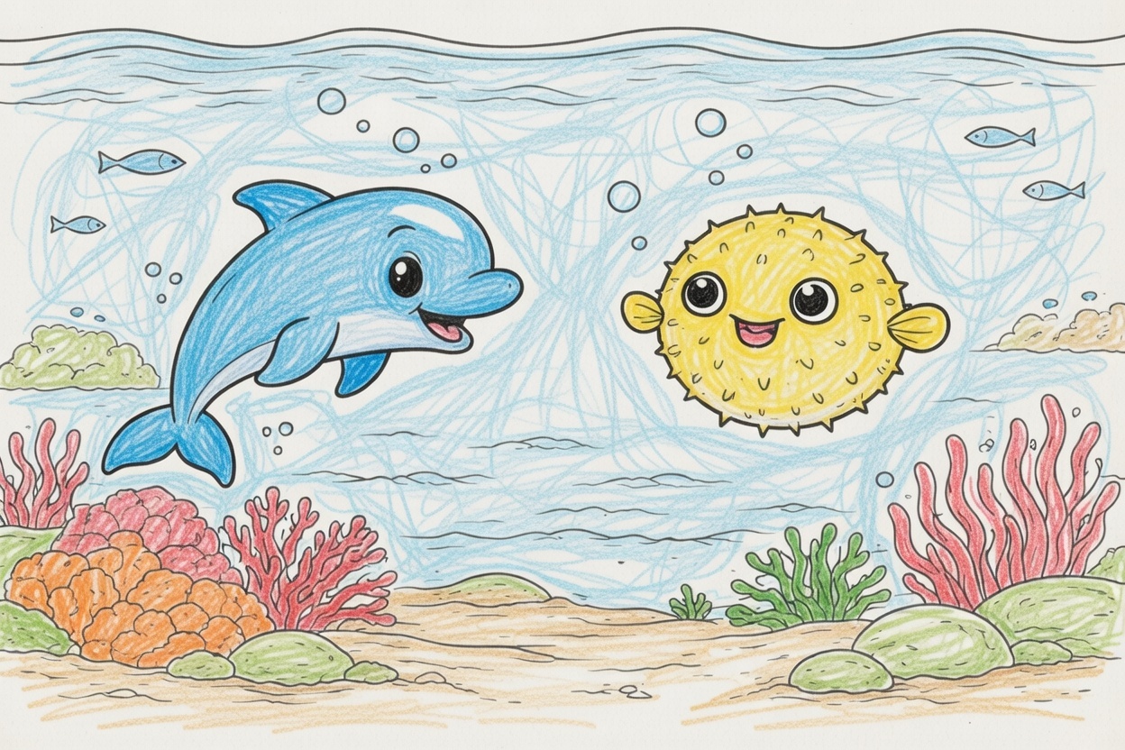 Printable coloring page for kids and toddlers showing a curious baby dolphin meeting a friendly pufferfish underwater. Simple shapes and bold outlines make it easy and fun for preschool coloring.