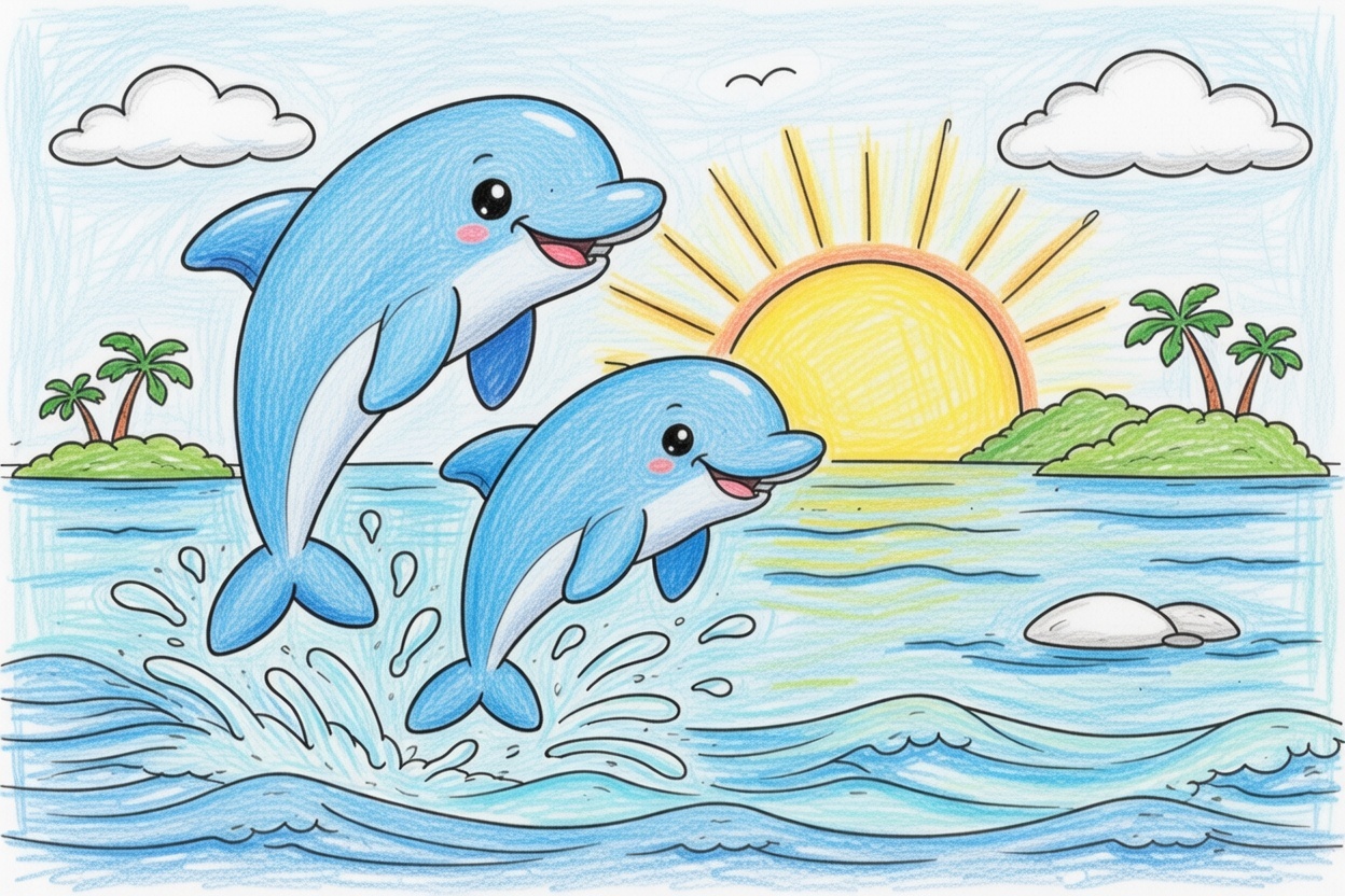 Printable coloring page for kids and toddlers showing two happy dolphins jumping in the sea at sunset. Simple shapes and bold outlines make this preschool coloring page easy and fun.