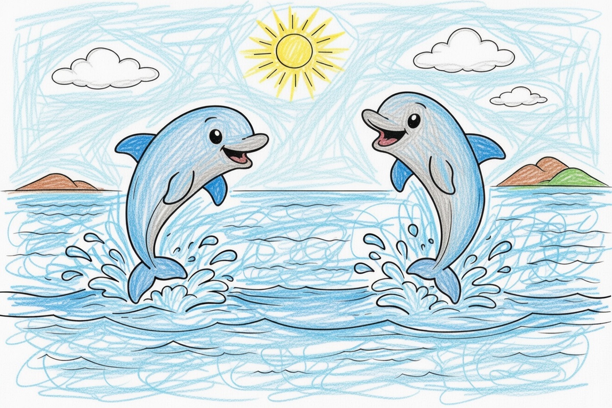 Printable coloring page for kids and toddlers with two playful dolphins jumping in the ocean. Big shapes and bold outlines make this simple coloring page perfect for preschool children.