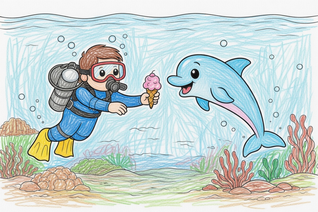Printable coloring page for kids and toddlers showing a scuba diver giving ice cream to a baby dolphin underwater. Big shapes and bold outlines make it easy and fun for preschool coloring.