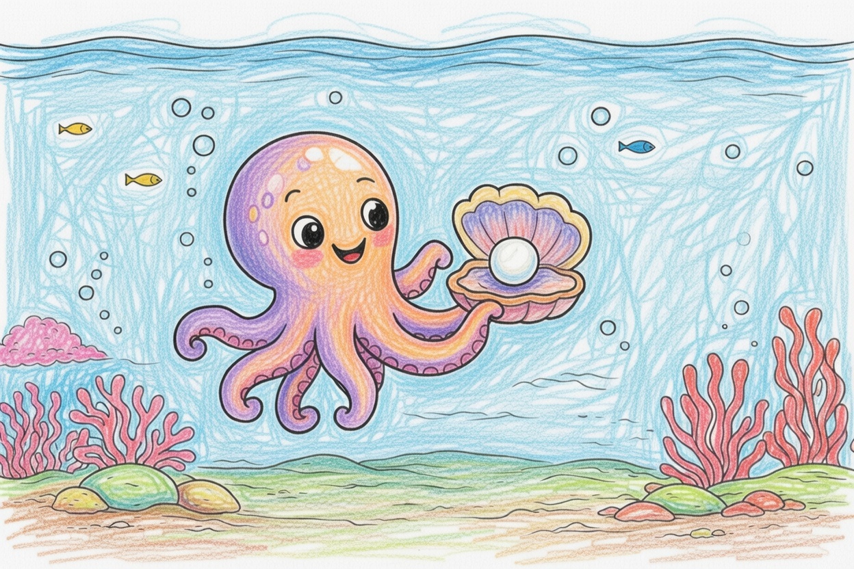 Printable coloring page for kids and toddlers with a happy octopus who found a beautiful pearl underwater. Big shapes and bold outlines make this simple page perfect for preschool coloring.