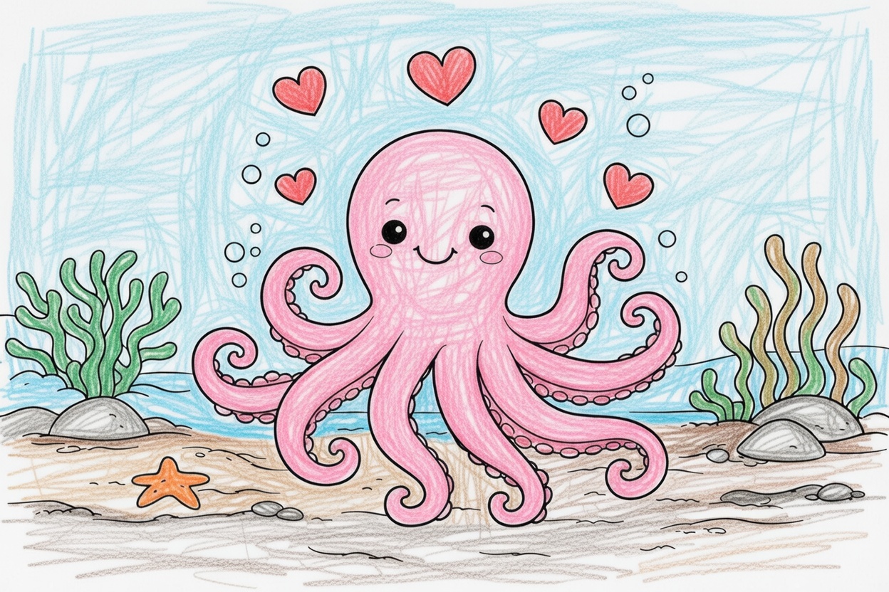 Printable coloring page for kids and toddlers with a cute octopus in love. Big shapes and bold outlines make this simple underwater coloring page perfect for preschool children.