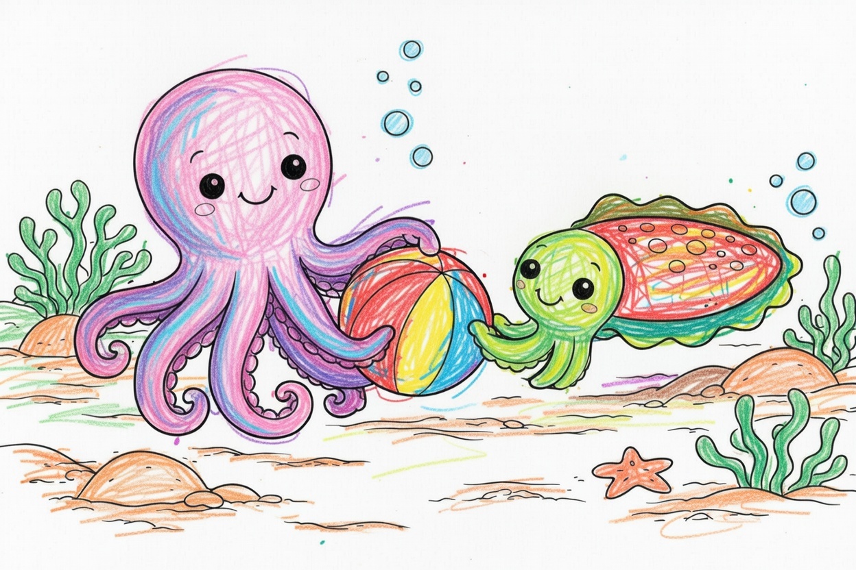 Printable coloring page for kids and toddlers showing a cute octopus playing with a friendly cuttlefish. Big shapes and bold outlines make this simple underwater coloring page easy to color.