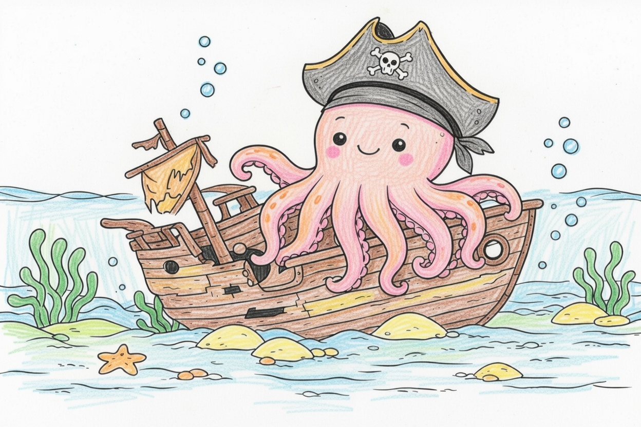 Printable coloring page for kids and toddlers with a calm octopus in a pirate hat sitting on a sunken ship. Simple shapes and bold outlines make this preschool coloring page easy to color.