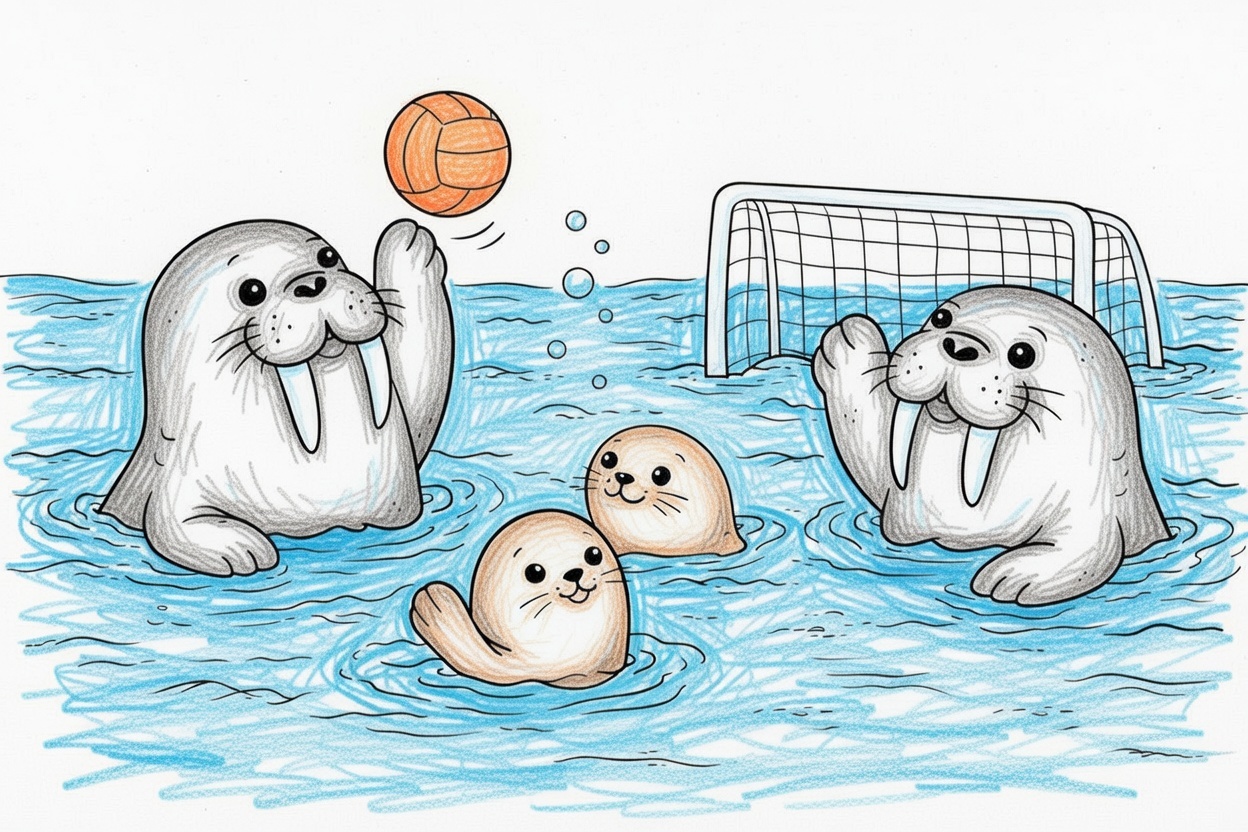 Printable coloring page for kids and toddlers showing walruses and seals playing water polo. Big shapes and bold outlines make this fun preschool coloring page easy to color.