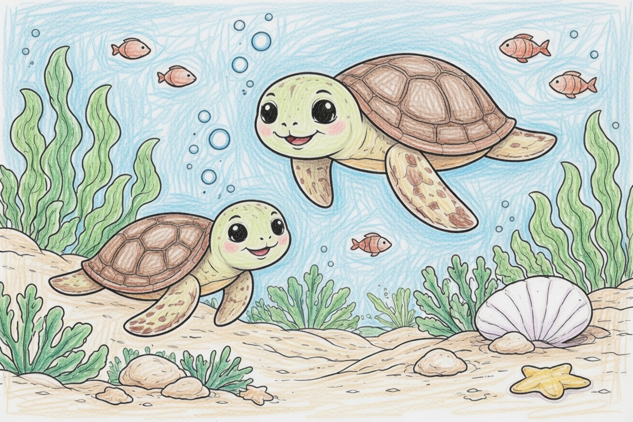 Printable coloring page for kids and toddlers with beautiful sea turtles swimming in deep water. Simple shapes and bold outlines make this preschool coloring page easy and relaxing to color.