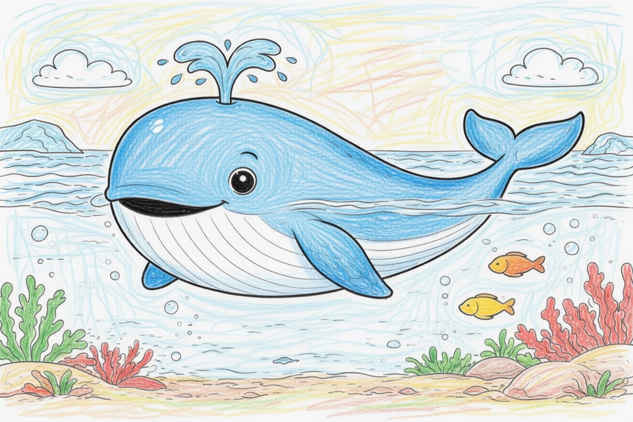 Printable coloring page for kids and toddlers with a big friendly blue whale swimming in the ocean and spraying water. Simple shapes and bold outlines make it easy for preschool coloring.