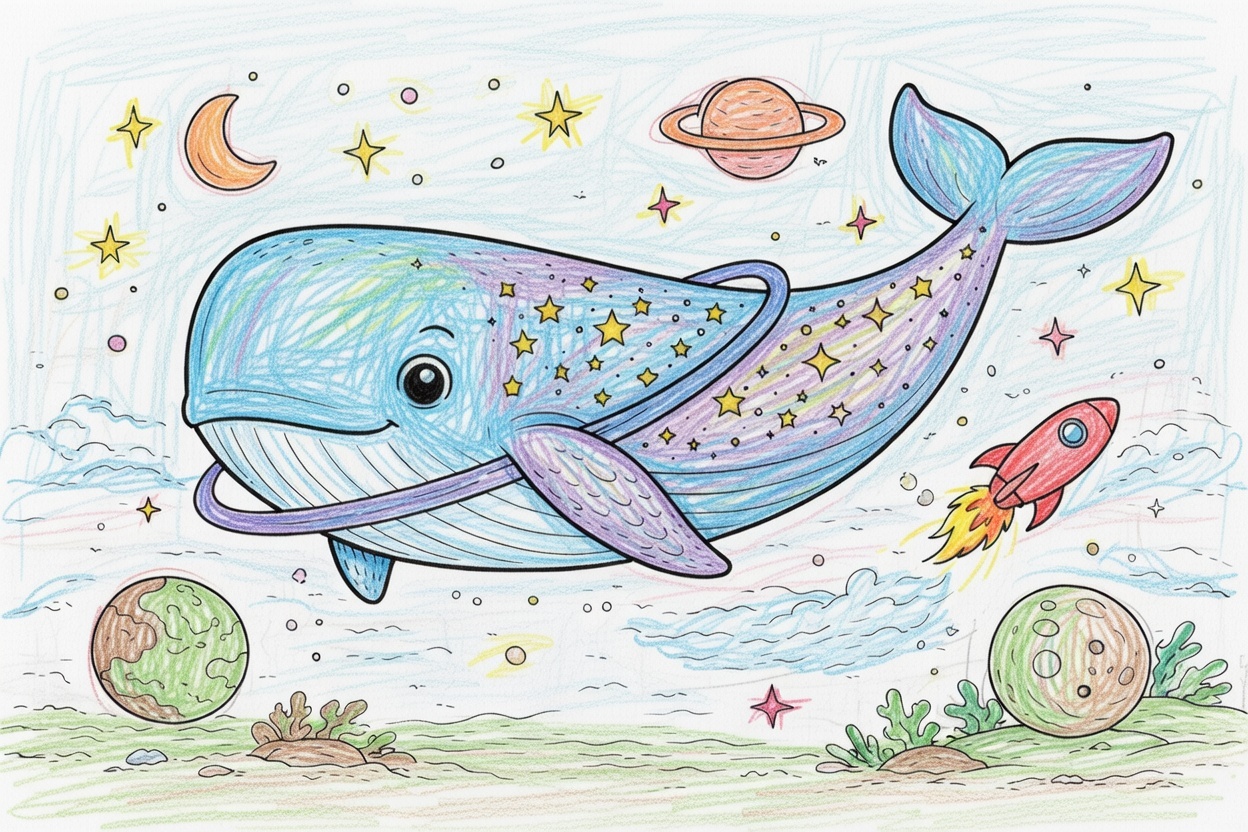 Printable coloring page for kids and toddlers featuring a cute space whale flying among stars and planets. Simple shapes and bold outlines make this preschool coloring page easy and fun.