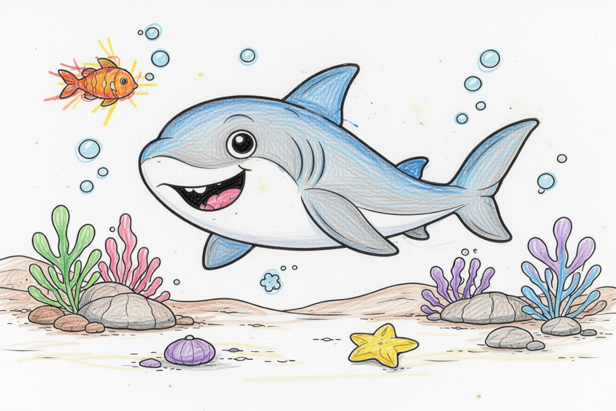 Printable coloring page for kids and toddlers featuring a happy baby shark swimming underwater. Simple shapes and bold outlines make this coloring page easy and fun for preschool children.