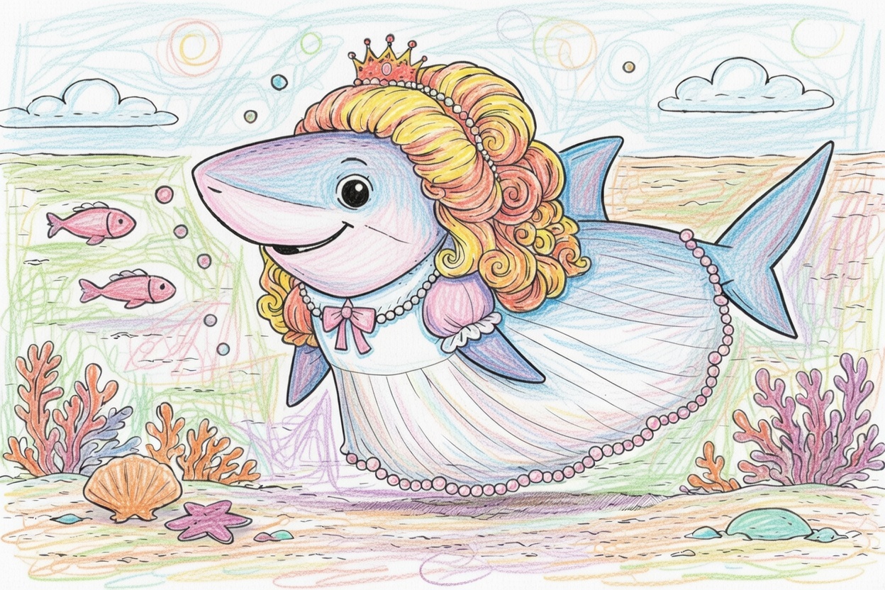 Printable coloring page for kids and toddlers featuring a cute princess shark with a crown and flowing dress. Simple shapes and bold outlines make it easy and fun for preschool coloring.